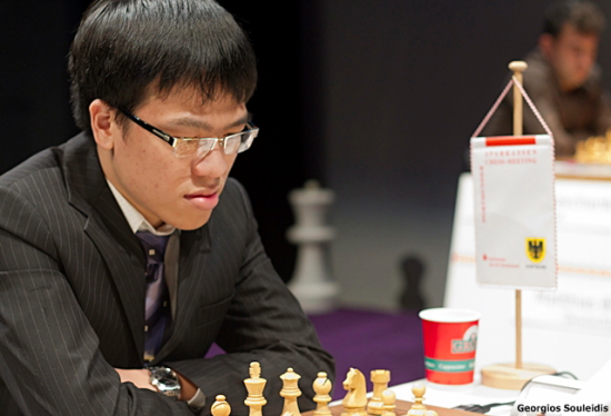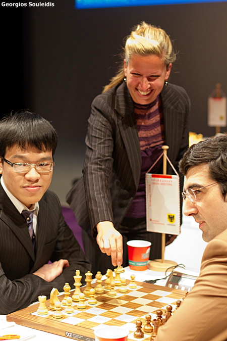 29.07.2011 - Es kam dem Tanz auf der Rasierklinge gleich, doch letztlich überstand Vladimir Kramnik in der achten Runde des Sparkassen Chess-Meeting in Dortmund seine schlechte Stellung gegen Liem Quang Le ohne Schnittwunden. Dennoch hätte er sich nicht beklagen können, wenn er auf der Zielgeraden zu seinem zehnten Titel in Pott gegen den jungen Vietnamesen gestrauchelt wäre. Erneut gestrauchelt, aber ebenfalls nicht gefallen ist heute Georg Meier. Die ganze Partie über musste der Deutsche einen Minusbauer gegen Anish Giri verwalten, aber das tat er im Großen und Ganzen gut und verdiente sich so den halben Punkt gegen den niederländischen Meister. Mit einem Remis hätte auch Hikaru Nakamura zumindest halbwegs leben können, aber wie schon in der Hinrunde hatte Ruslan Ponomariov auch heute andere Pläne. Der Ukrainer setzte den Amerikaner früh unter Druck und erntete im Endspiel die Früchte seiner Bemühungen. Während Kramnik weiterhin komfortabel mit zwei Punkten vor Quang Le führt, teilen sich Meier und Nakamura die rote Laterne.