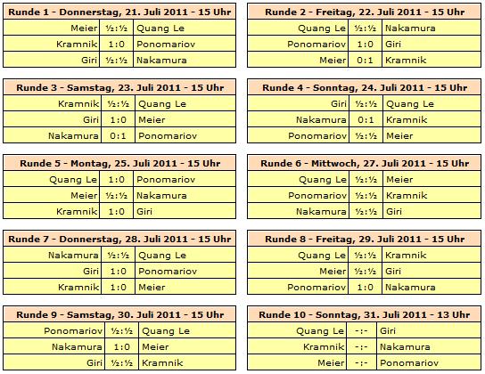 Mit einem ELO-Schnitt von 2731 wird die Turnierkategorie 20 erreicht. Rundenstart ist täglich um 15:00 Uhr, lediglich die letzte Runde beginnt bereits um 13:00 Uhr. Wie schon in den Vorjahren werden die Partien mit einer Verzögerung von 15 Minuten ins Internet übertragen. Ein Ruhetag wird eingelegt - nämlich am 26. Juli.