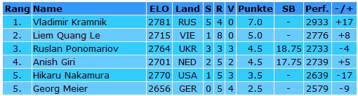 Die Teilnehmer am Sparkassen Chess-Meeting 2011 Georg Meier (2656), Liem Quang Le (2715), Vladimir Kramnik (2781), Ruslan Ponomariov (2764), Anish Giri (2701) & Hikaru Nakamura (2770)