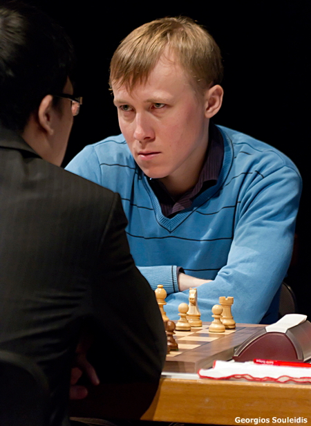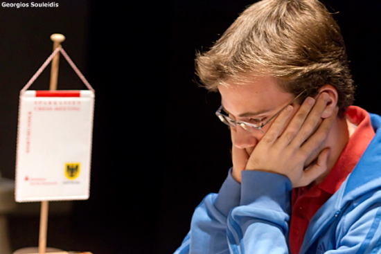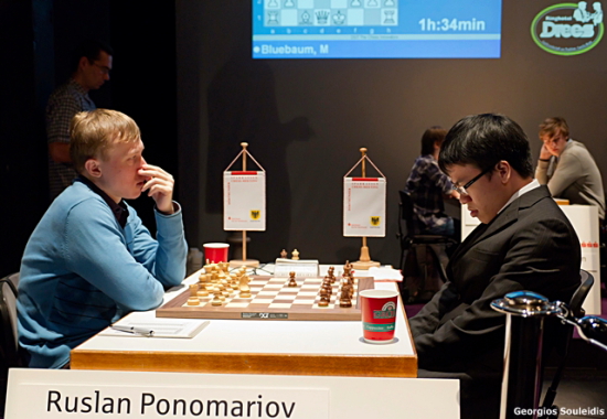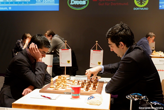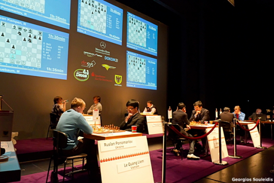 30.07.2011 - In der neunten Runde des Sparkassen Chess-Meeting ließ Vladimir Kramnik nichts mehr anbrennen. Um seinen zehnten Titel in Dortmund zu sichern, benötigte der 14. Weltmeister lediglich ein Remis gegen Anish Giri und dieser dachte gar nicht daran, den Spielverderber zu mimen. Als ihm Kramnik die Möglichkeit bot, eine dreimalige Stellungswiederholung zu erzwingen, ließ sich der junge Niederländer nicht lange bitten und machte seinen Gegner so zum mehr als verdienten Turniersieger. Zumindest ein kleines Lächeln dürfte auch Hikaru Nakamura heute über das Gesicht gehuscht sein, denn er konnte Georg Meier besiegen. Obwohl der Deutsche erneut eine gute Partie spielte, sein immenser Zeitverbrauch brach ihm letztlich und ebenfalls erneut das Genick. Weitaus friedlicher gestaltete sich das Duell zwischen Ruslan Ponomariov und Liem Quang Le. Beide mühten sich zwar 49 Züge lang redlich, aber der Gegner wollte einfach nicht patzen und so musste der Punkt geteilt werden. Somit hat der Vietnamese weiterhin den zweiten Platz inner, aber noch können ihn Giri (im direkten Duell) und Ponomariov (gegen Meier) abfangen. Die letzte Runde beginnt morgen übrigens schon um 13 Uhr - die "Live"-Übertragung entsprechend um 13:15 Uhr. Am Ende dieses Berichtes finden Sie noch ein Video aus der Schmiede der DeepChess!!!-Crew mit Anish Giri, Georg Meier und Klaus Bischoff im Interview.