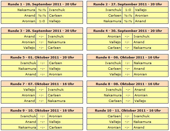 Das Chess Masters Final São Paulo / Bilbao 2011 findet vom 26. September bis 01. Oktober Im brasilianischen São Paulo statt und zieht zur Halbzeit ins spanische Bilbao um, wo dann vom 06. bis 11. Oktober die zweite Hälfte ausgetragen wird.