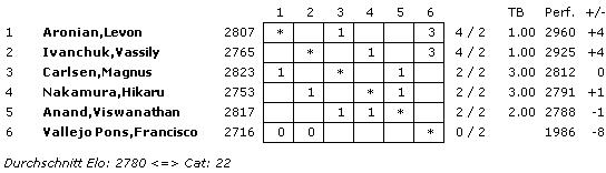 Mit einem ELO-Schnitt von sensationellen 2780 wird die bisher höchste Turnierkategorie 22 erreicht. Rundenstart in São Paulo ist täglich um 20:00 Uhr unserer Zeit. Aus Bilbao wird es dann keine Zeitverschiebung geben - dann beginnen die Partien um 16:00 Uhr.