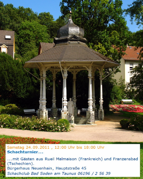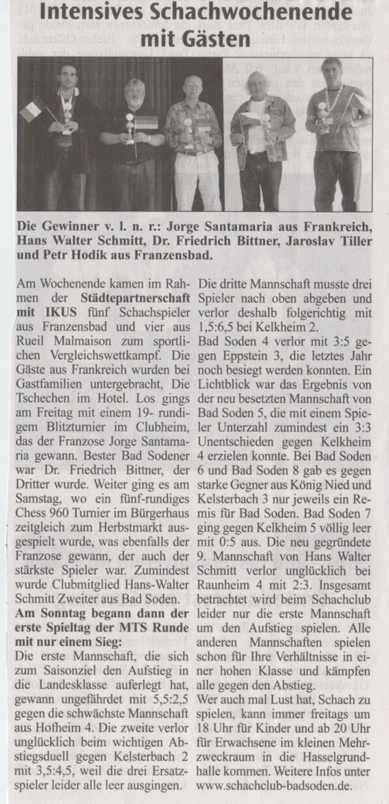 "Im Übrigen ist Bad Soden so etwas wie eine Hauptstadt des Schachs, hier lebt der amtierende Weltmeister saisonal, hier hat er sich auf die Weltmeisterschaften in Mexiko 2007, Bonn 2008 gegen Kramnik und Sofia 2010 gegen Topalov mit seiner Crew vorbereitet, hier hat er sich 2000 im Parkhotel den Schnellschach-WM-Titel geholt gegen Kasparov, Kramnik, Shirov, Morozevich und Leko beim bisher einzigen Top-Ten-Meeting in der 160-jährigen Turniergeschichte des Schachs. Der SC Bad Soden am Taunus ist mit über 100 Mitgliedern und 9 aktiven Mannschaften tätig und auch der Sitz des Chess Tigers Training Center GmbH und die Aktivitäten des Schach-Förderverein 1999 e.V. als Veranstalter der Chess Classic nahmen hier ihren Ursprung. Sogar die Grundlagen zur Realisierung des späteren Chess960 wurden hier in einem Match zwischen GM Artur Jussupow und "Fritz on Primergy" uraufgeführt. Bad Soden ist natürlich nur eine ganz unbedeutende "Hauptstadt", aber eine sehr schachafine und vielleicht erwächst aus dem unbedeutenden internationalen Turnierchen zum Neuenhainer Herbstmarkt 2011 schon in naher Zukunft eine Internationale Bad Sodener Stadtmeisterschaft. Der Bad Sodener Bürgermeister Norbert Altenkamp ist dem Schach sehr nahe stehend, trotzdem ist die Kritik an der Stadtverwaltung und Politik unbegründet und völlig unangebracht - Schuld ist nur die Ungenauigkeit Schmitts!