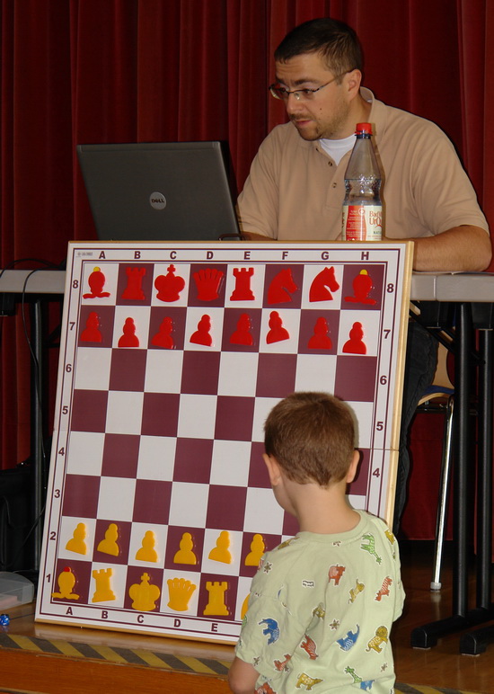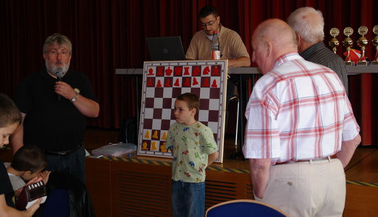 Turnierleiter Börries Wendling gibt den Takt vor: 5 Runden Schweizer System, Bedenkzeit 20min Basiszeit plus 5s additive Zeit pro Zug! Der jüngste Teilnehmer im Feld Lukas Martin stellt schon mal die neue Position auf.