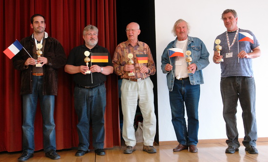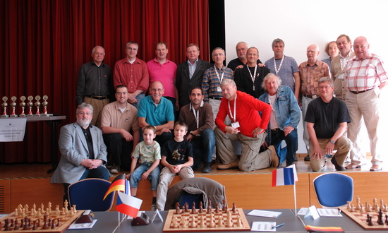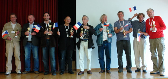 Die acht Ersten (fünf im Bild) v.r.n.l.: 1. Jorge Santamaria 5,0/5 (Rueil Malmaison) 2. Hans-Walter Schmitt 4,0/5 Bad Soden 3. Dr. Friedrich Bittner 3,5/5 Bad Soden) 4. Jaroslav Tiller 3,0 (Franzensbad) 5. Petr Hodik 3,0/5 Franzensbad) 6. Dr. Reiner Martin 3,0/5 (Bad Soden) 7. Marc Herouard 3,0/5 (Rueil Malmaison) 8. Yves Lagache 3,0/5 (Rueil Malmaison)