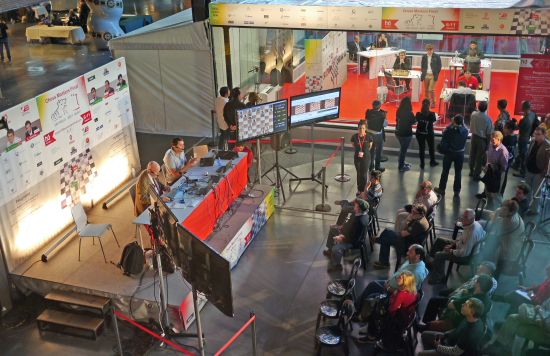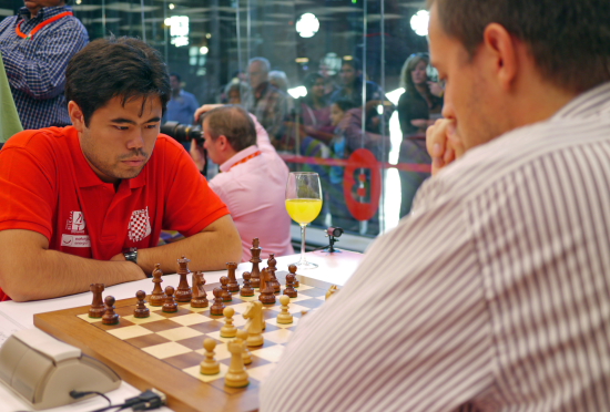 10.10.2011 - Spannender könnte die Lage vor der morgigen Schlussrunde beim Chess Master Final 2011 nicht mehr sein. Im heutigen Spitzenduell musste Vassily Ivanchuk endgültig seine einst komfortable Führung aufgeben. Der Ukrainer unterlag in einer Taktikschlacht den Rechenkünsten von Magnus Carlsen, so dass dieser nun ebenfalls 14 Punkte auf dem Konto hat. So gut wie ausgeschieden aus dem Rennen um den Turniersieg ist dagegen Hikaru Nakamura. Der Amerikaner verlor im Bemühen, aus seinem Königsinder gegen Francisco Vallejo etwas Zählbares herauszuholen die Uhr aus dem Blick und verlor im 40. Zug(!) auf Zeit. Ein mieser Tag für ihn, wie auch Weltmeister Viswanathan Anand, welcher gegen Levon Aronian aus der Eröffnung erstaunlich schnell unter Druck geriet und nach einem schlimmen Überseher bald das Handtuch werfen musste. Nakamura müsste morgen mit Weiß Carlsen schlagen und Aronian mit Schwarz Ivanchuk, dann wären gleich vier Spieler punktgleich an der Spitze!