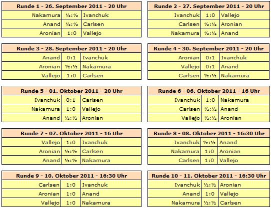 Viswanathan Anand erwischte kein gutes Turnier und es darf munter spekuliert werden, woran es lag. Tatsache ist, gegen Vallejo gelang ihm das, was sich die anderen Kollegen auch vorgenommen hatte, nämlich zwei Siege. Doch dem gegenüber stehen die Niederlagen gegen Ivanchuk und Aronian, die aber auch einem Champion einfach mal unterlaufen können und schlicht menschlich sind.