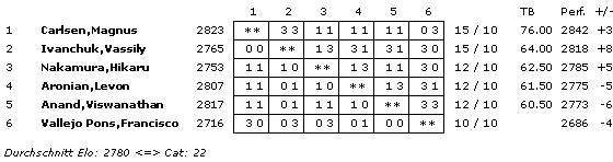 Mit einem ELO-Schnitt von sensationellen 2780 wurde die bisher höchste Turnierkategorie 22 erreicht.