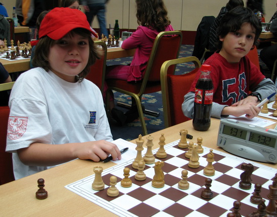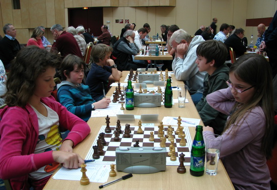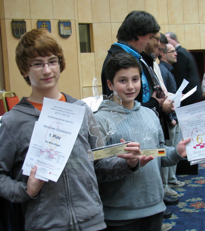 "Ja, vielleicht ist das Losglück für die letzte Runde Dir hold und Du bekommst einen leichteren Gegner als Ruben, weil Du einen halben Punkt weniger hast. Und mit einem Sieg kannst Du Ruben noch einholen, wenn er nur ein Remis gegen einen besseren Gegner macht". So kam es dann auch! Ruben spielte seinen schwarzfeldrigen Läufer im 4.Zug des Spaniers nach b4, obwohl er nachher bekannte, dass er nur Lc5 oder Le7 spielen sollte! Der Gegner Felix Zichner vom Siebenleher SV nutzte die Tempogewinne sehr gut aus, bekam einen heftigen Angriff und gewann die Partie schnell. Leo spielte gegen die DWZ-gleichstarke Friederike Tampe aus Darmstadt ruhig und langsam, gewann die Partie leicht und freute sich, dass er noch vor Ruben landete und genau wie sein Freund ungefähr 40 DWZ Punkte nach Schätzung des Trainers Hans-Walter Schmitt dazugewonnen hat. Als Belohnung dürfen die Beiden jetzt bei der Frankfurter Chess960-Stadtmeisterschaft beginnend am Montag, den 7.November 2011. in "ihrem" Training Center in der "B9" in Bad Soden teilnehmen, um eine erste IPS (Individual Player Strength) im "Modernen Schach" zu erwerben.