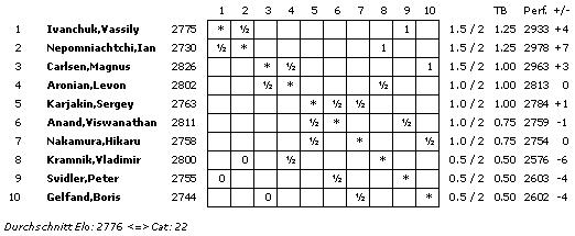 Mit einem ELO-Schnitt von 2776 wird die Turnierkategorie 22 erreicht. Rundenstart ist täglich um 12:00 Uhr unserer Zeit, lediglich die letzte Runde beginnt bereits um 10:00 Uhr. Der einzige Ruhetag wird am 21. November eingelegt.