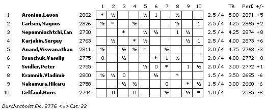 Mit einem ELO-Schnitt von 2776 wird die Turnierkategorie 22 erreicht. Rundenstart ist täglich um 12:00 Uhr unserer Zeit, lediglich die letzte Runde beginnt bereits um 10:00 Uhr. Der einzige Ruhetag wird am 21. November eingelegt.