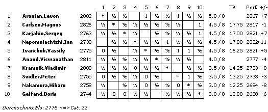 Mit einem ELO-Schnitt von 2776 wird die Turnierkategorie 22 erreicht. Rundenstart ist täglich um 12:00 Uhr unserer Zeit, lediglich die letzte Runde beginnt bereits um 10:00 Uhr. Der einzige Ruhetag wird am 21. November eingelegt.