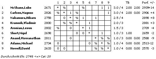 Die London Chess Classic findet vom 03. bis 12. Dezember bereits zum dritten Mal statt. In diesem Jahr wurde die Teilnehmerzahl des einrundigen Rundenturniers bewusst ungerade gehalten. So hat jeder Spieler einen weiteren Ruhetag beziehungsweise eine Runde, in welcher er live die Partien der Konkurrenz mitkommentiert.