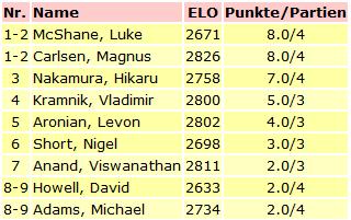 TopTurniere Carlsen und McShane führen in London Drei Schwarzsiege in Runde 4 Morgen ist Ruhetag