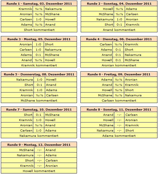 Mit einem ELO-Schnitt von 2748 wird die Turnierkategorie 20 erreicht. Rundenstart ist täglich um 15:00 Uhr unserer Zeit. Lediglich am Nikolaustag wird erst um 17:00 Uhr gestartet und in der Schlussrunde bereits um 13:00 Uhr. Der einzige gemeinsame Ruhetag wird am 07. Dezember eingelegt.