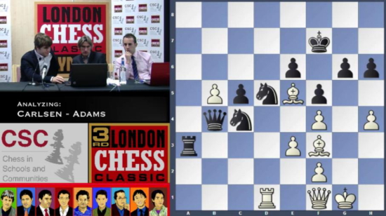 Hier hatte Adams zuletzt 35...Sb6-c4?? gespielt und Carlsen durfte in der Analyse nochmals zeigen, warum dies ein ganz schlimmer Fehler war