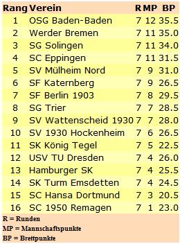 12.12.2011 - Weil man in der zweiten Runde gegen Mülheim verlor, musste sich Meister OSG Baden-Baden die Tabellenspitze der Schachbundesliga zunächst mal von unten ansehen. Doch nach dem zurückliegenden Wochenende sind die Mannen von Kapitän Sven Noppes wieder voll auf Meisterkurs. Zwei deutliche Siege gegen den einstigen Tabellenführer SV Wattenscheid und Abstiegskandidat Hansa Dortmund und zeitgleich das 4:4 zwischen Werder Bremen und SC Eppingen bedeuten erstmals die alleinige Führung. Diese wird auch mindestens bis Anfang Februar 2012 Bestand haben, denn erst dann wird das nächste Bundesliga-Wochenende stattfinden. Auf dem zweiten Rang werden die Werderaner überwintern und Solingen auf Rang 3 vor den punktgleichen Eppingern.