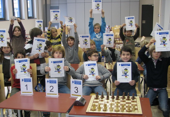 Die Erstklässler der Geschwister-Scholl-Schule in Schwalbach beim Gruppenfoto nach der 13.Übungstunde "Schach". Insgesamt sind 36 Kinder erstmals in Schach-AGs erfolgreich auf Vishy Anand's Spuren.
