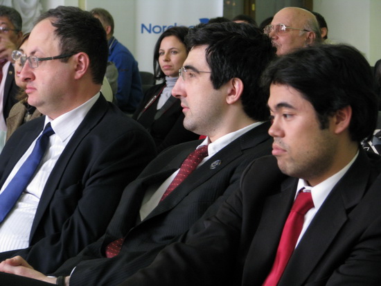 Nichts mit dem WM-Kampf zu tun haben die Sieger von 2011 Magnus Carlsen (Norwegen) und Levon Aronian (Armenien). In der Mitte sitzt Jan Nepomniachtchi (Russland)