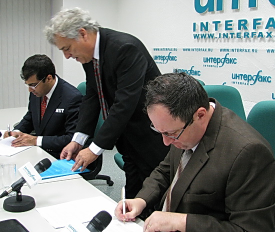 Viswanathan Anand (Indien) - Israel Gelfer (FIDE) - Boris Gelfand (Israel) unterzeichnen die Verträge mit allen sportlichen und technischen Regularien für den WM-Kampf