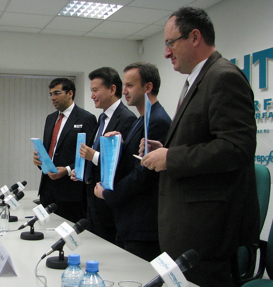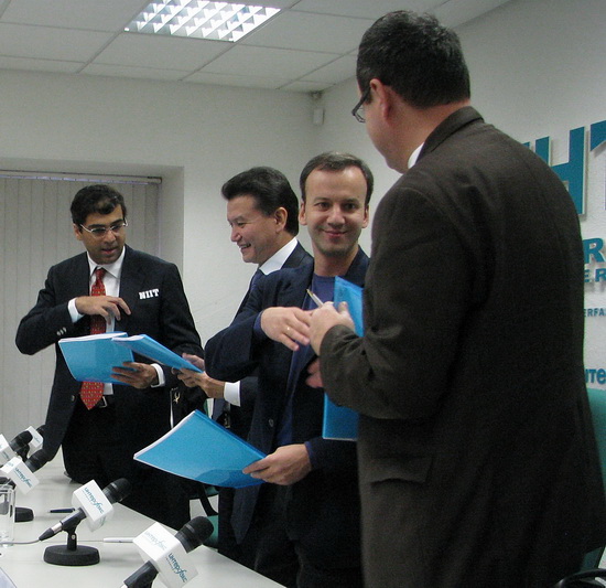 Weltmeister Viswanathan Anand (Indien), Fide-Präsident Kirsan Ilyumzhinov, Minister für Wirtschaft Alexander Dvorkovich und Herausforderer Boris Gelfand (Israel) haben alle Bedingungen akzeptiert ...