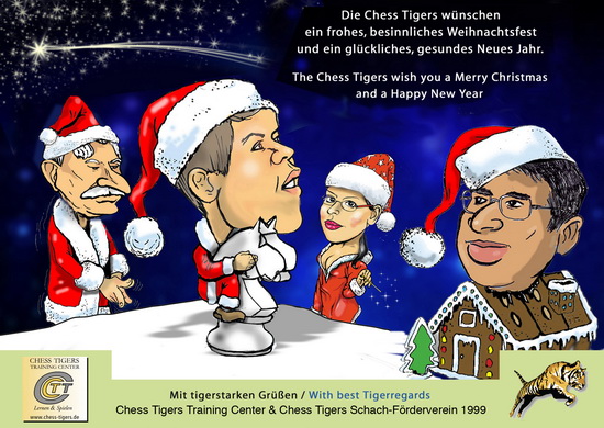 Das ganze Team aus dem Chess Tigers Training Center und der Chess Tigers Schach-Förderverein 1999 bedankt sich bei allen Kunden & Lieferanten, Studenten & Schülern, Freunden & Förderern für ein erfolgreiches Jahr 2011. Wir wünschen ein ruhiges Weihnachtsfest und für 2012 Optimismus, Geundheit und Wohlergehen.