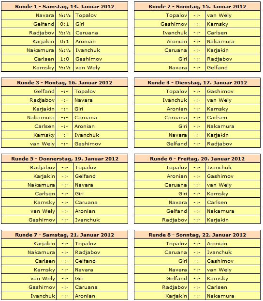 Rundenstart ist jeweils um 13:30 Uhr, lediglich die letzte Runde am 29. Januar beginnt bereits um 12:00 Uhr. Ruhetage werden am 18., 23. und 26. Januar eingelegt.