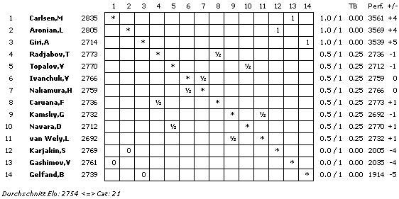 14.01.2012 - Auf dem Papier sind Magnus Carlsen und Levon Aronian die heißesten Anwärter auf den so prestigeträchtigen Gewinn der A-Gruppe beim 72. Tata Steel Chess Tournament. Die beiden einzigen 2800er in Wijk aan Zee legten in der heutigen Auftaktrunde sogleich mal vor und besiegten ihre Gegner. Aronian schlug mit Schwarz Sergey Karjakin und Carlsen tat es ihm mit Weiß gegen Vugar Gashimov gleich. Doch noch jemand konnte sich an die Spitze gesellen. Der Jüngste im Feld schlug den Ältesten. Anish Giri rang den WM-Herausforderer Boris Gelfand nieder und zeigt nach seinem Triumph in Reggio Emilia weiterhin eine bestechende Form. Vier entschiedene Partien gab es in der B-Gruppe. Auch dort konnte mit Illya Nyzhnik ein Jungstar seine Auftaktpartie (gegen Viktorija Cmilyte) gewinnen. In der C-Gruppe endeten fünf Partien mit einem Sieger. Leider gehört Elisabeth Pähtz nicht dazu. Im Gegenteil, sie verlor mit den weißen Steinen gegen den schwedischen GM Hans Tikkanen. Die zweite Runde startet am Sonntag um 13:30 Uhr.