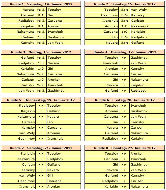 Rundenstart ist jeweils um 13:30 Uhr, lediglich die letzte Runde am 29. Januar beginnt bereits um 12:00 Uhr. Ruhetage werden am 18., 23. und 26. Januar eingelegt.