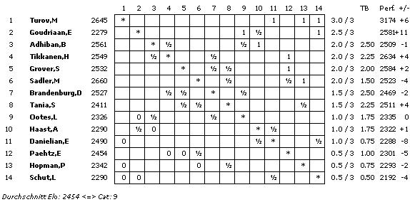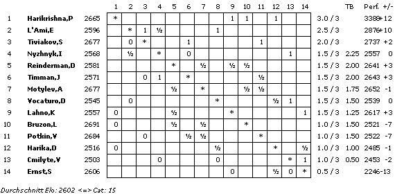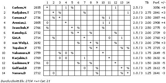 Die A-Gruppe erreicht mit einem ELO-Schnitt von 2754 die Kategorie 21 (2011: 2739/20), die B-Gruppe 2602 und Kategorie 15 (2658/17) und die C-Gruppe 2454 und Kategorie 9 (2507/11).