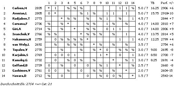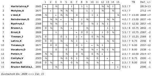 Die A-Gruppe erreicht mit einem ELO-Schnitt von 2754 die Kategorie 21 (2011: 2739/20), die B-Gruppe 2602 und Kategorie 15 (2658/17) und die C-Gruppe 2454 und Kategorie 9 (2507/11).