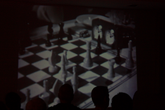 Sodann konnte sich das Publikum an einem Stummfilm aus den Anfangszeiten des Vereins vergnügen, den der verstorbene Schachfreund. Erich Heilig 1963 mit Laiendarstellern des Clubs gedreht hatte. Es handelt sich um einen in Super-8 aufgenommenen Kurzspielfilm, den man im vergangenen Jahr digitalisiert hatte. Der Film handelt von Besuch eines arabischen Scheichs, der als Superblitzweltmeister vom Nieder Lokalmatador herausgefordert wird. Der Wettkampf endet – Überraschung! - mit einem friedlichen Remis.
