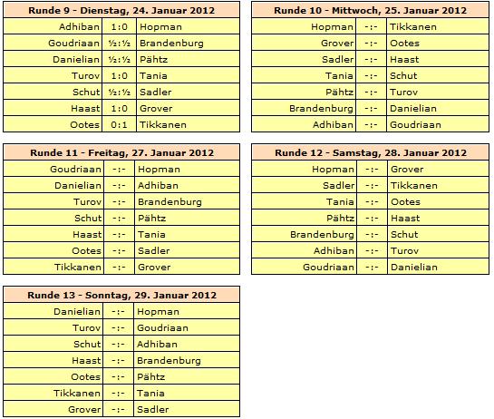 In der B-Gruppe konnte sich Spitzenreiter Pentala Harikrishna etwas mehr Luft verschaffen. Der Inder schlug mit Schwarz Teenager Illya Nyzhnyk, während Konkurrent Alexander Motylev von Viktorija Cmilyte nur einen halben Punkt erhielt. Mit unter den ärgsten Verfolgern ist nun (endlich) auch Erwin l'Ami angekommen, und auch Lazaro Bruzon hat vielleicht noch einen Funken Hoffnung. In der C-Gruppe führen seit der letzten Runde Maxim Turov und Hans Tikkanen gemeinsam die Tabelle an und tun dies auch nach der heutigen. Beide Spieler konnten ihre Partie gewinnen und werden den Gruppensieg wohl unter sich ausmachen. Elisabeth Pähtz trennte sich unentschieden von Elina Danielian. Die zehnte Runde beginnt am Mittwoch um 13:30 Uhr.