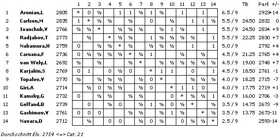 Die A-Gruppe erreicht mit einem ELO-Schnitt von 2754 die Kategorie 21 (2011: 2739/20), die B-Gruppe 2602 und Kategorie 15 (2658/17) und die C-Gruppe 2454 und Kategorie 9 (2507/11).
