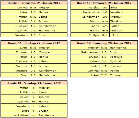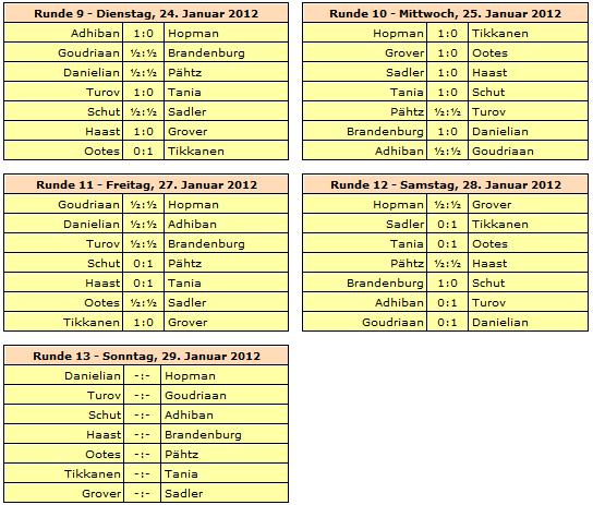 Rundenstart ist jeweils um 13:30 Uhr, lediglich die letzte Runde am 29. Januar beginnt bereits um 12:00 Uhr. Ruhetage werden am 18., 23. und 26. Januar eingelegt.