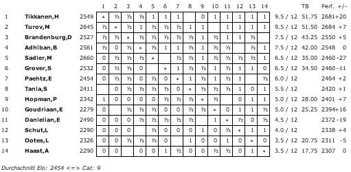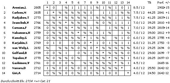 Die A-Gruppe erreicht mit einem ELO-Schnitt von 2754 die Kategorie 21 (2011: 2739/20), die B-Gruppe 2602 und Kategorie 15 (2658/17) und die C-Gruppe 2454 und Kategorie 9 (2507/11).