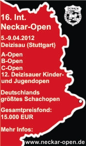 Das Internationale Neckar-Open in Deizisau zählt eindeutig zu den allergrößten Turnier-Highlights im deutschen Schachkalender. In diesem Jahr findet es vom 05. bis 09. April (also Ostern) bereits zum 16. Mal statt und schon jetzt haben sich wieder zahlreiche Titelträger und Amateure angekündigt. Titelverteidiger Arkadij Naiditsch wird versuchen, seinen Triumph zu wiederholen, während sein Freund und Baden-Badener Mannschaftskollege Etienne Bacrot darauf sinnen wird, dies zu verhindern und sein bescheidenes Ergebnis (Rang 39) aus dem Vorjahr wett zu machen. Das Format des 16. Int. Neckar-Open hat sich nicht verändert. Es werden parallel ein A-, ein B- und ein C-Open mit jeweils 9 Runden Schweizer System gespielt. Die Bedenkzeit beträgt 2 Stunden für 40 Züge plus 30 Minuten für den Rest der Partie. Alle drei Turniere werden nach DWZ ausgewertet und das A- und das B-Open zugleich auch nach ELO. Im A-Open können wie immer auch Titel-Normen erspielt werden. Der Preisfonds im A-Open beläuft sich auf üppige 11.600,- Euro, von denen allein 3.000,- auf den Sieger warten. Das B-Open (DWZ/ELO <2000) ist mit 2.800,- dotiert, von denen 1.000,- auf den Gewinner warten. Im C-Open (<1400) sind 600,- Euro insgesamt und 250,- für den Sieger im Topf. Dazu wird es auch wieder das beliebte Kinder- und Jugendopen geben.