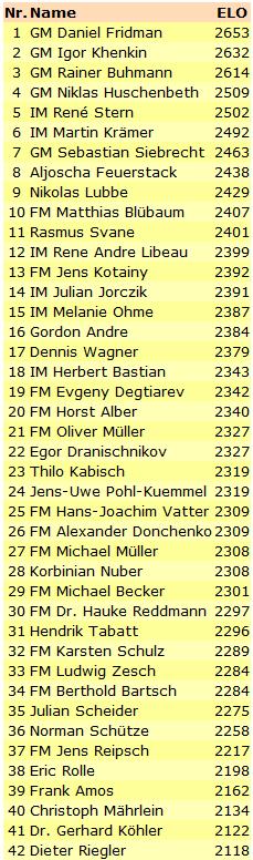 In der Folge haben wir für Sie alle Teilnehmer nach ELO sortiert aufgeführt, wobei wir der Turnierseite einen Schritt voraus sind und die aktuellen Zahlen der just erschienenen März-Liste der FIDE herausgesucht haben.
