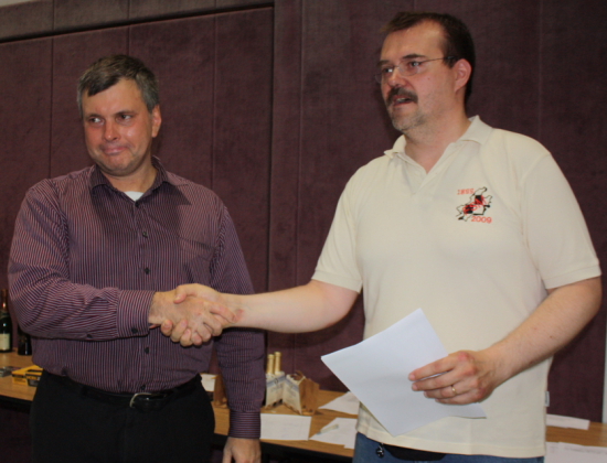 Turnierleiter Hans-Dieter Post gratulierte 2011 GM Igor Khenkin und überreichte neben dem Preisgeld auch den...