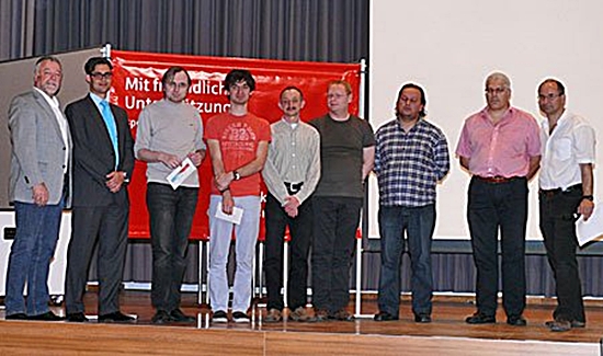 Siegerehrung 2011 (v.l.n.r.): Bürgermeister Franz Masino, Markus Lang von der Sparkasse Ettlingen, IM Mikhail Zaitsev, IM Ilja Schneider, GM Vladimir Gurewich, IM Till Wippermann, FM Josef Gheng, Turnierleiter Dr. Matthias Kleifges und Schachclub-Vorsitzender Clemens Linowski