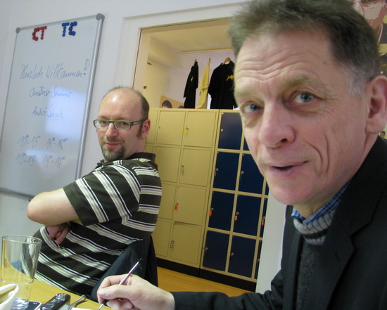 André Schulz: Seht her, hier habt Ihr das, was Ihr braucht PC, Kaffee, Chessbase 11 mit Repertoire-Datenbank und Fritz13 mit "Let's check"
