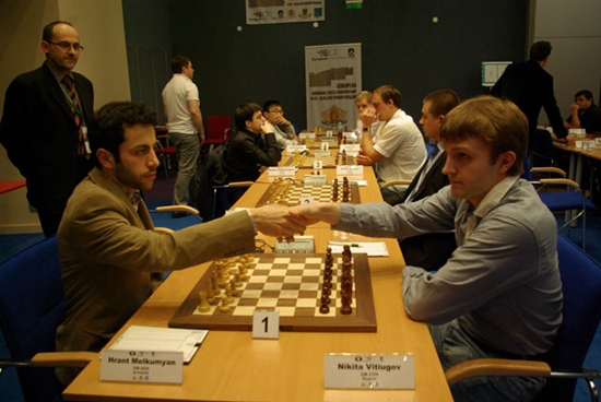 Hrant Melkumyan beim Handshake mit Nikita Vitiugov zum Start der 4. Runde
