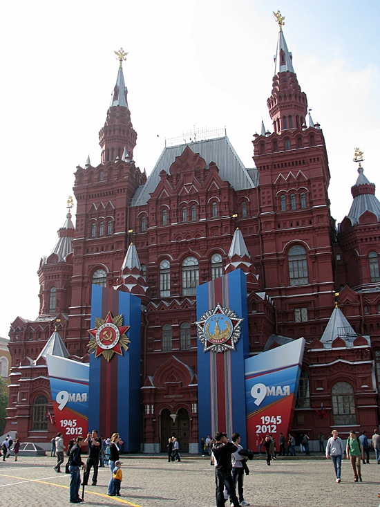 09.05.2012 - Russland hat mit großem Abstand die meisten Schachspieler, die den Titel "Großmeister" zu Recht tragen dürfen, direkt sind sie diesmal allerdings nur als geschäftstüchtige Veranstalter involviert und haben die potenten Sponsoren für den WM-Kampf gewinnen können. Unmittelbar vor Beginn der Schach-WM zwischen dem amtierenden Weltmeister Anand aus Indien und seinem Herausforderer Gelfand aus Israel hat Russland am 7.Mai 2012 Vladimir Putin als neuen Präsidenten inthronisiert, mittlerweile seinen Vorgänger Dimitry Medvedev zum neuen Ministerpräsidenten gemacht, und heute am 9.Mai mit großem Stolz die Befreiung von Hitler-Deutschland gefeiert. Wir haben ein paar Bilder zusammengestellt, die diesen besonderen Tag Revue passieren lassen. In unseren Hotelzimmern konnten wir bei geschlossen zu haltenden Fenstern und bei laufender Fernseher den offiziellen Teil miterleben, ehe wir uns am Nachmittag unters Volk mischten.