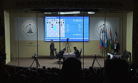 11.05.2012 - Bisher gehörte die Grünfeldindische Verteidigung nicht zum Standard-Repertoire von Boris Gelfand, aber genau diese wählte er in der heutigen Auftaktpartie zur Schachweltmeisterschaft 2012 gegen Titelverteidiger Viswanathan Anand. Selbst wenn der Inder davon überrascht wurde, er ließ es sich nicht anmerken und wählte seinerseits ein seltenes Abspiel. Aber sein israelischer Gegenüber kannte sich offenkundig gut genug aus, um alsbald ein ausgeglichenes Endspiel herbeizuführen, in welchem eher Schwarz etwas angenehmer stand. Doch die Partie endete schließlich nach 24 Zügen mit dem Friedensschluss, und die Kontrahenten waren sich in der anschließenden Pressekonferenz einig, dass Computer vielleicht einen Vorteil für Schwarz sehen, die Schlussstellung aber völlig ausgeglichen sei. Damit ist die WM nun auch offiziell auf dem Brett gestartet. Morgen um 13:00 Uhr MEZ wird Gelfand seine erste Weißpartie eröffnen.