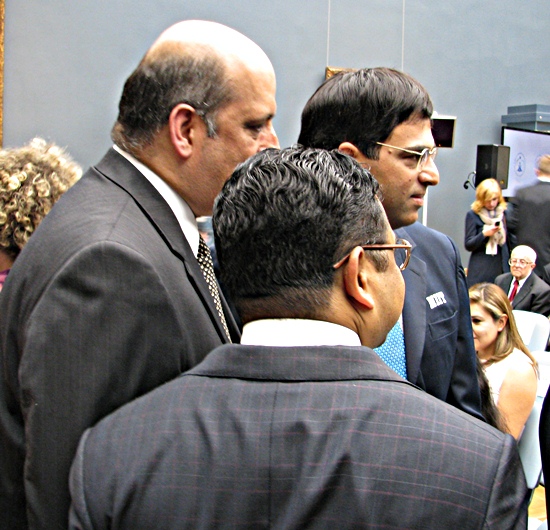 Sponsor Andrey Filatov begrüsst die Teilnehmer von v.r.n.l : Viswanathan Anand (Weltmeister, Indien), Arkardy Dvorkovich (Chairman Russian Chess Federation), Kirsan Ilyumzhinov (President FIDE), Irena Lebedeva (Direktorin Tretjakow-Galerie) und Boris Gelfand (Herausforderer, Israel) überbrachte wertvolle Schachfiguren.