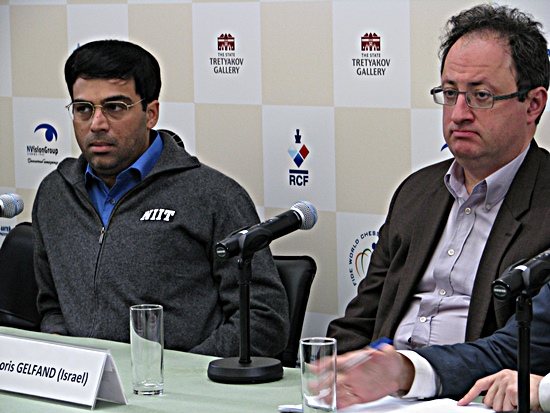 Anand und Gelfand waren sichtlich zufrieden mit ihrem 25-zügigen Remis, aber die Frage schmeckte ihnen nicht
