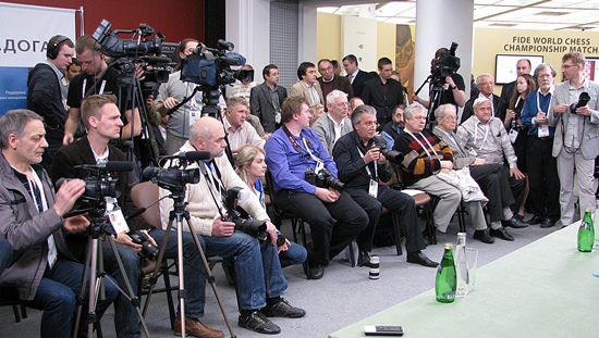 Die 3.Partie sollte es in sich haben, wir dokumentieren vom Beginn bis zum Ende der Pressekonferenz ein paar Szenen, die subjektiv auch ein bisschen pro Anand gefärbt sind. Sie, als Leser sollten wissen, dass die Chess Tigers zu Hause mit GM Klaus Bischoff und Redakteur Mike Rosa sich zum Ziel gesetzt haben, Sie möglichst hautnah - deutsche Live-Kommentare - und ebenso zeitnah das Ergebnis mit ersten Analysen unmittelbar nach Ende der Partie zu versorgen. Eric van Reem (englisch auf "Mate in Moscow") und Hans-Walter Schmitt "Kurz vor der nächsten Partie" beschränken sich vor Ort auf Hintergrund und besondere Eindrücke und Stimmungen, nicht nur aus der Tretjakow-Galerie, sondern auch aus Moskau allgemein und sowieso drumherum.