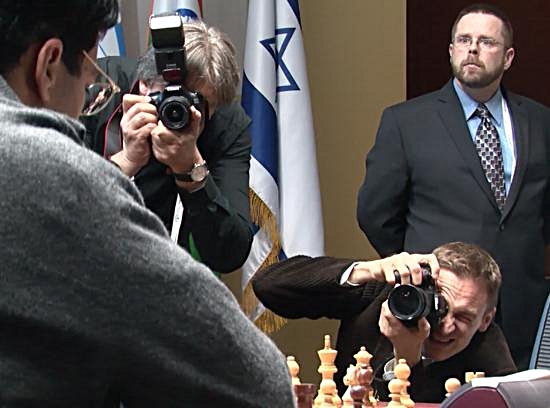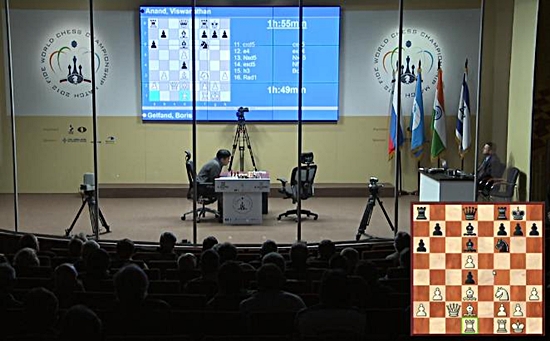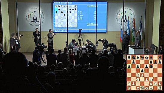 Während Boris Gelfand nach nahezu jedem Zug aufsprang und von der Bühne flüchtete, war bald klar, dass Vishy Anand auch in der zweiten Schwarzpartie alles im Griff hatte
