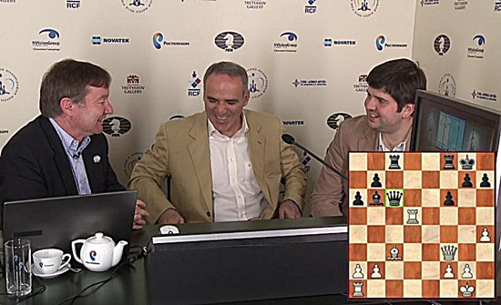 18.05.2012 - Zum dritten Mal wurde heute bei der Schach-WM in Moskau mit Boris Gelfand als Weißer die Slawische Verteidigung probiert und zum dritten Mal erreichte der Herausforderer nichts. Viswanathan Anand glich früh und ohne große Mühe aus und machte damit (vielleicht endgültig?) klar, dass der Israeli so nicht auf Sieg spielen kann. Nach nicht ganz drei Stunden und 29 Zügen wurde das Remis unterzeichnet. Das Highlight der sechsten Partie war somit leider der Besuch des 13. Weltmeisters Garry Kasparov, welcher sich in einer Pressekonferenz und beim Gastauftritt bei der Live-Kommentierung nicht sehr positiv zu dem bisherigen Matchverlauf äußerte. Er gab zudem zu Bedenken, dass Gelfand seit 1993 nicht mehr gegen Anand gewonnen habe und jedes Remis schon ein Erfolg sei. Kein gutes Omen für die zweite Hälfte des Matches, aber glücklicherweise hat auch Kasparov die Weisheit nicht mit Löffeln gefressen. Übrigens, wer sich noch erinnert: Die WM 1995 in New York zwischen Anand und Kasparov begann damals mit acht(!) Remisen! Am Samstag jedenfalls haben die Spieler in Moskau ihren nächsten Ruhetag, bevor Gelfand am Sonntag erneut mit Weiß aufschlagen darf.
