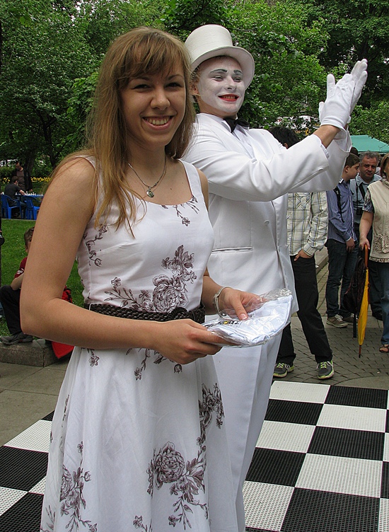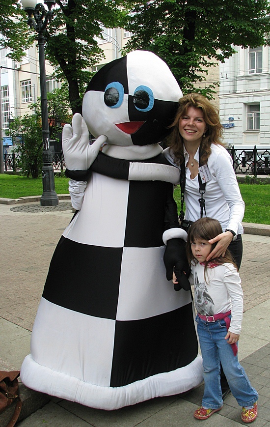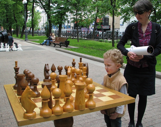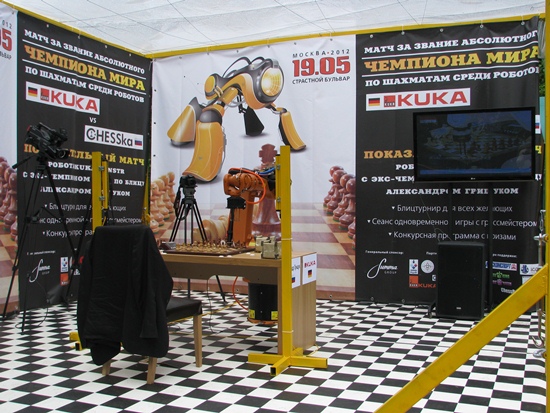 Der russische Weltmeister im Blitzschach, Alexander Grischuk, setzte sich hier in Moskau an einen Tisch mit einem Roboter aus Deutschland, dessen schachliche Fähigkeiten wohl aus dem bekannten Schachprogramm von Rybka 4 stammen soll. Der Vater des Schachprogramms ist Vasik Railich, der unter der USA-Flagge firmiert, und in den letzten Jahren die führende Engine unter den spielstärksten Programmen perfektioniert hatte. Im Match um den "World Robot Chess Champion" hatte er sich am gleichen Tag zuvor gegen CHESSka aus Russland durchgesetzt und somit gegen den Top10-Spieler und World-Blitz-Champion Grischuk durchzusetzen. In der Qualifikation des Kandidatenturniers in Kazan (Russland) war er an Boris Gelfand im Finale gescheitert. Ich glaube, er hätte dieser Tage lieber in der Tretjakov-Galerie gesessen und gegen Anand gespielt, als sich hier in 5-Minuten-Partien von einem nimmermüden Gegner bearbeiten zu lassen. Trotz des ungleichen Kampfes konnte Grischuk am Anfang in den drei Weißpartien gut mithalten und verlor erst die 4 Partie mit Schwarz, alle anderen waren vorher remis ausgegangen!! Wow, Mensch - Maschine ist auch ziemlich ausgeglichen, dachte ich, wobei die Zeit eine entscheidende Rolle gegen den Mensch einnimmt. Danach drehte Alexander das Risiko Not gedrungen höher und verlor prompt die letzten zwei Partien auch noch. Vielleicht war neben der beginnende Müdigkeit auch die notwendige Präzision nicht mehr da, sodass es am Ende 4,5:1,5 für den deutschen Roboter "KUKA" hieß. Alles in allem sahen wir ein unglaubliches Spektakel und viele Schachinteressierte kamen spielten selbst Schach und amüsierten sich im "Grünen" des Strastnoy Boulevard mitten in Moskau.